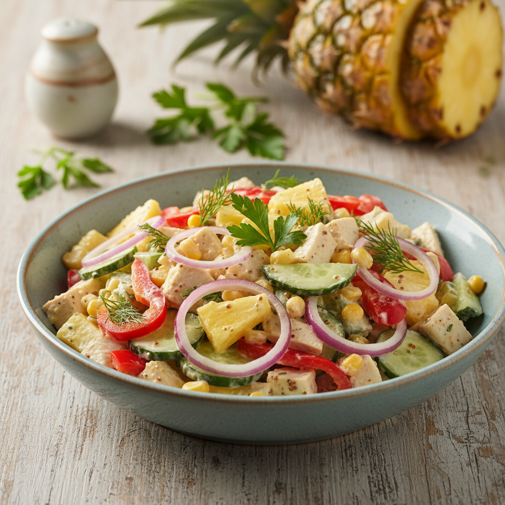 Be to, šios salotos ne tik gardžios, bet ir maistingos. Vištiena suteikia baltymų, ananasai – vitamino C bei skaidulų, o daržovės papildys patiekalą antioksidantais ir spalvų įvairove. Tai puikus derinys sveikam gyvenimo būdui.