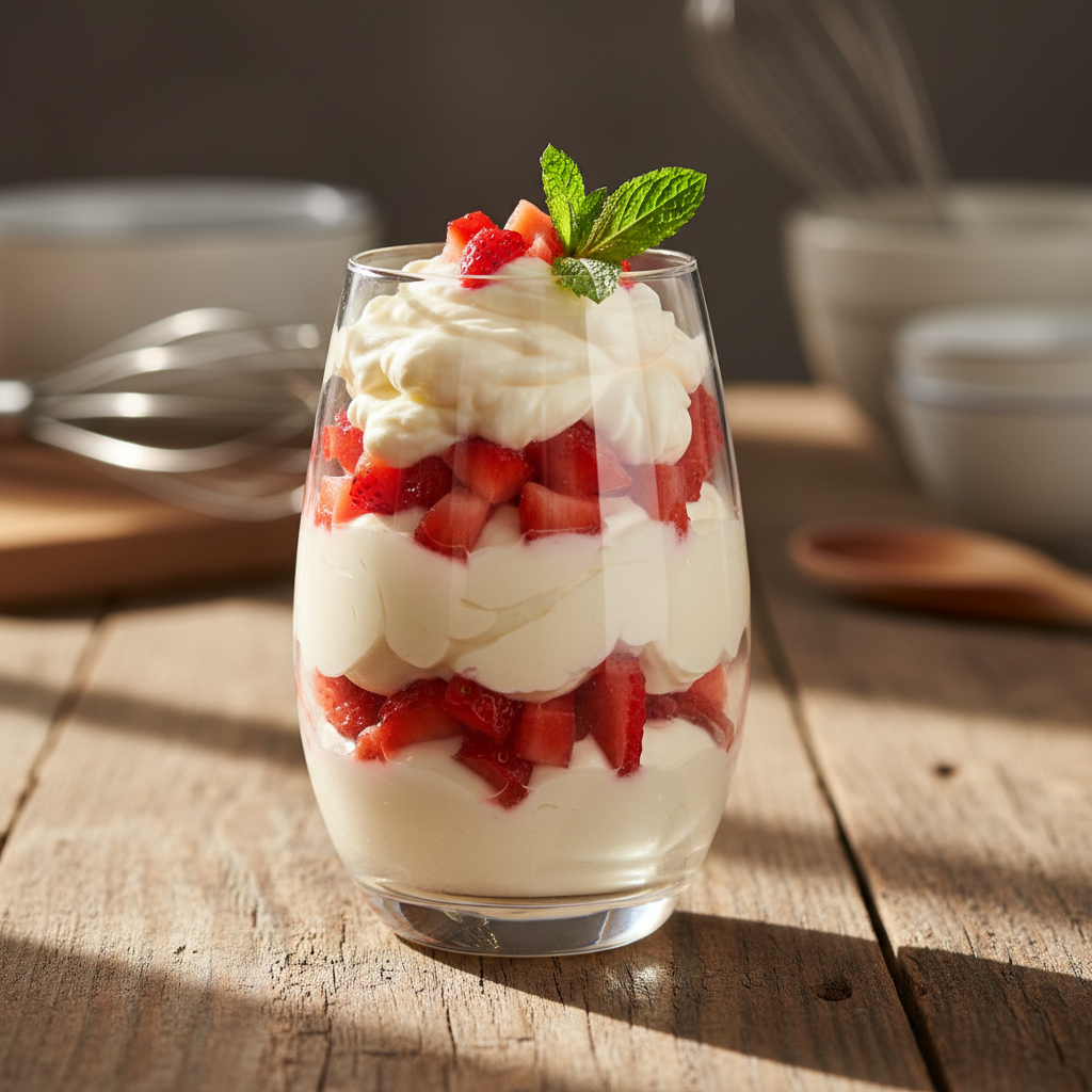 Braškių ir maskarponės kremas stiklinėje