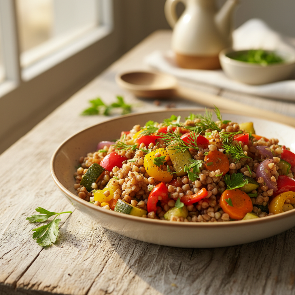 Universalus grikių ir keptų daržovių receptas
