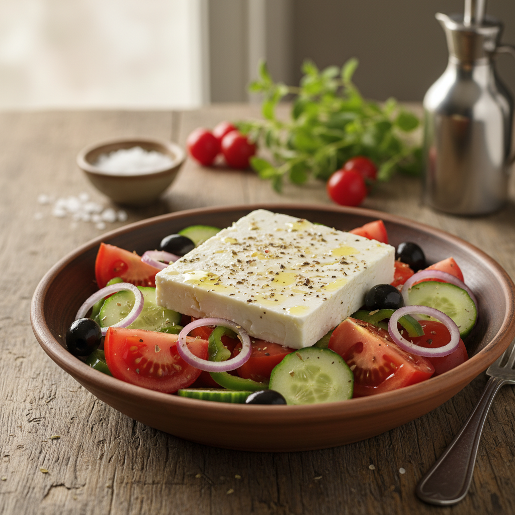Visi šie ingredientai turi būti švieži. Pavyzdžiui, pomidorai turėtų būti sultingi, bet ne pernokę, agurkai – tvirti, o alyvuogės – be kauliukų. Feta turi būti autentiška, gaminta iš avies arba avies ir ožkos pieno mišinio, nes būtent tokia suteikia salotoms ypatingą skonį ir tekstūrą.