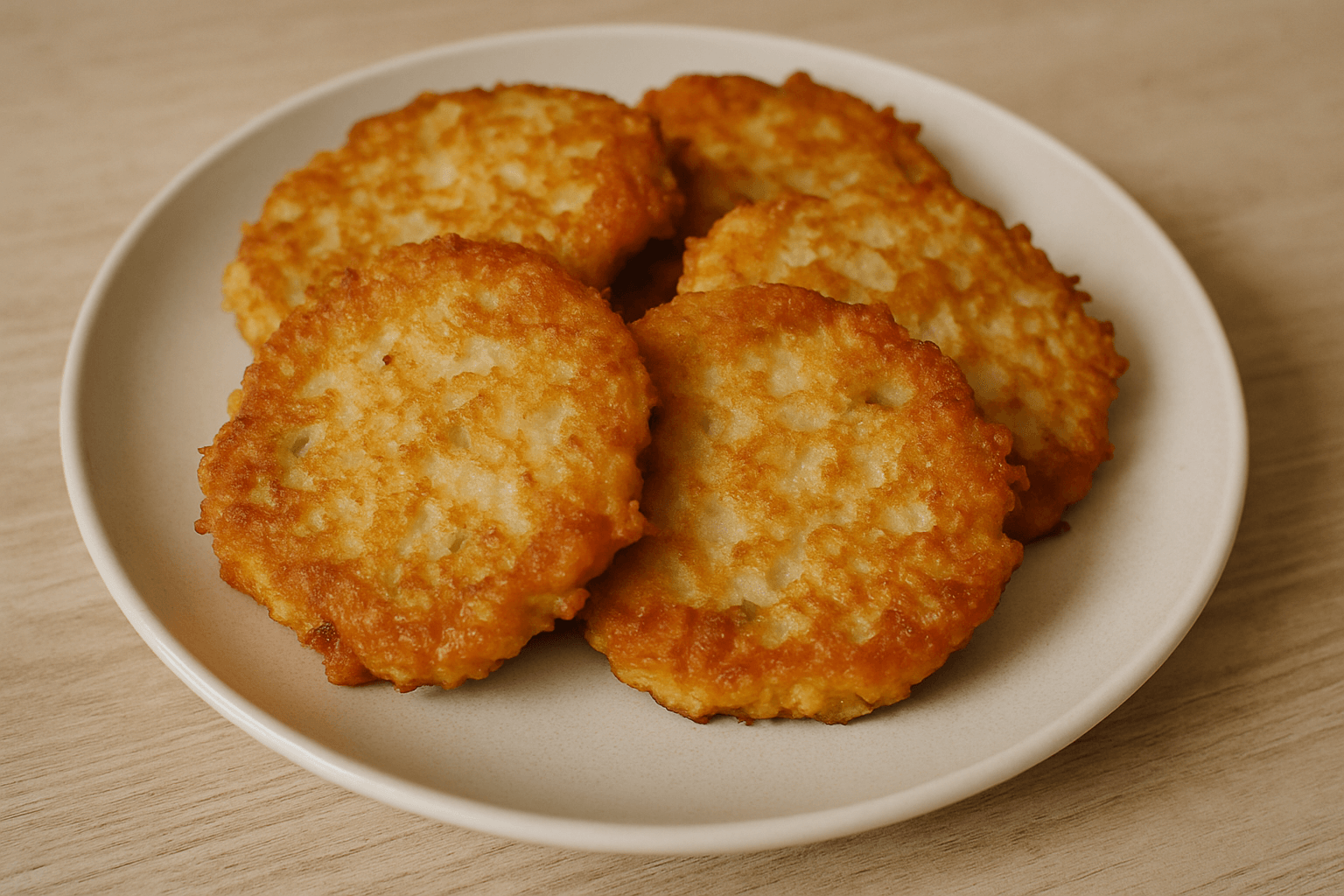 - Kepimas: Puodą ar keptuvę užpilkite aliejaus sluoksniu (~5 mm). Įkaitinkite ant vidutinės–aukštos kaitros. Dėkite blynelius po šaukštą masės – palikite tarp jų tarpą. Kepkite ~2–3 minutes, kol apačia apskrus. Tuomet apverskite ir kepkite dar ~2 minutes.